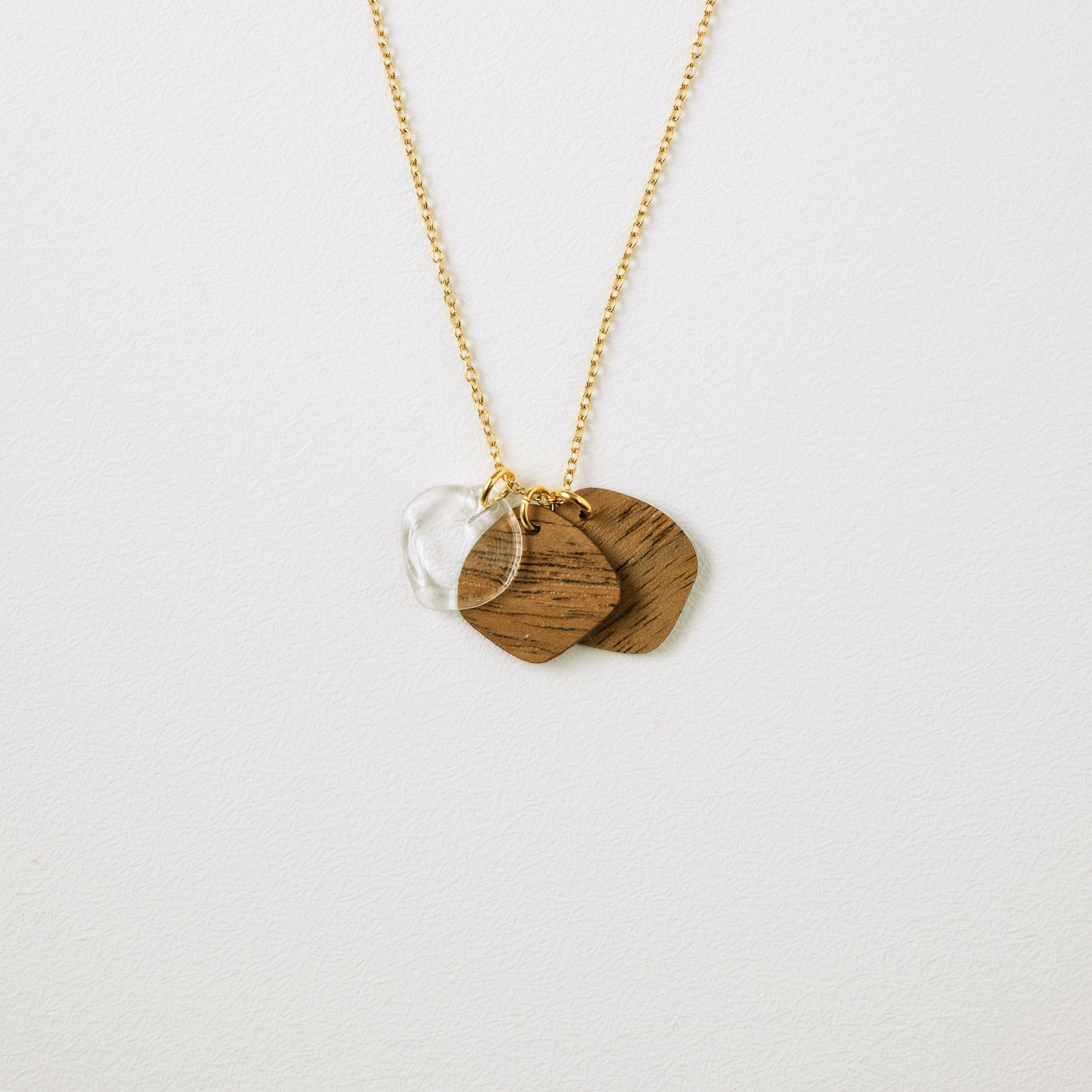 木とガラスによるアクセサリー(ピアス、イヤリング、ネックレス)を製作しています。割れにくく丈夫な突板も、旭川家具を支える材料屋さんだからこそ加工できる素材です。主役でも脇役でもなく、身に着けている人にそっと寄り添うアクセサリーになるようデザインしています。