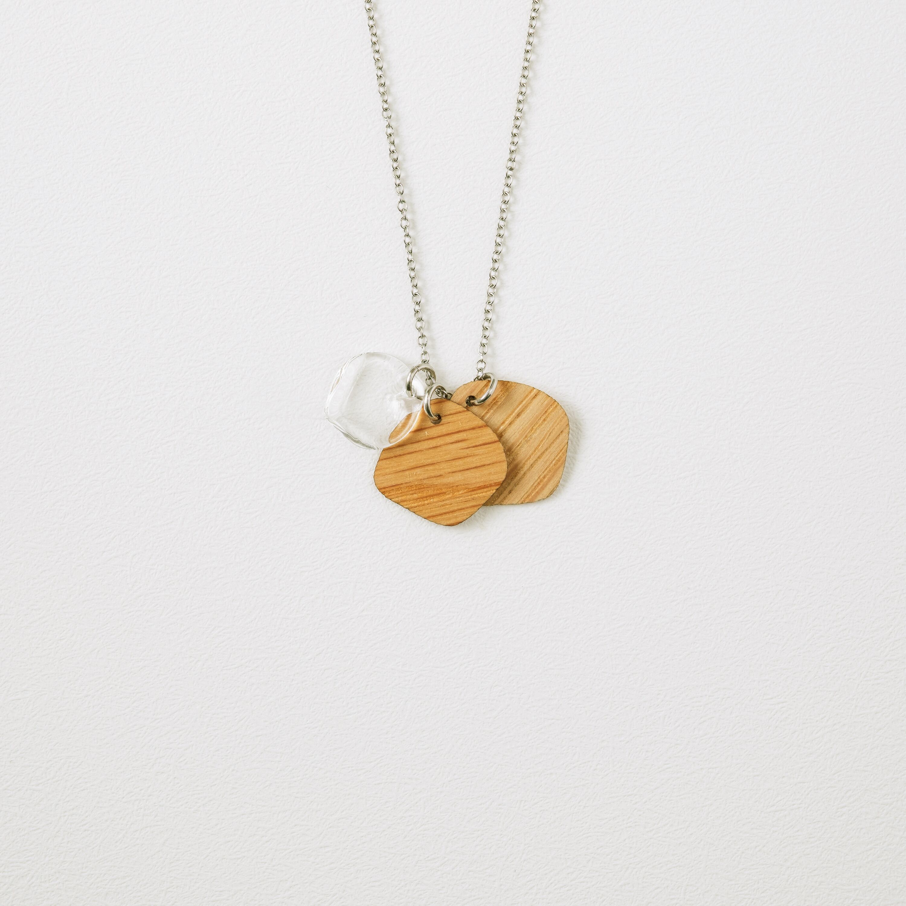 木とガラスによるアクセサリー(ピアス、イヤリング、ネックレス)を製作しています。割れにくく丈夫な突板も、旭川家具を支える材料屋さんだからこそ加工できる素材です。主役でも脇役でもなく、身に着けている人にそっと寄り添うアクセサリーになるようデザインしています。