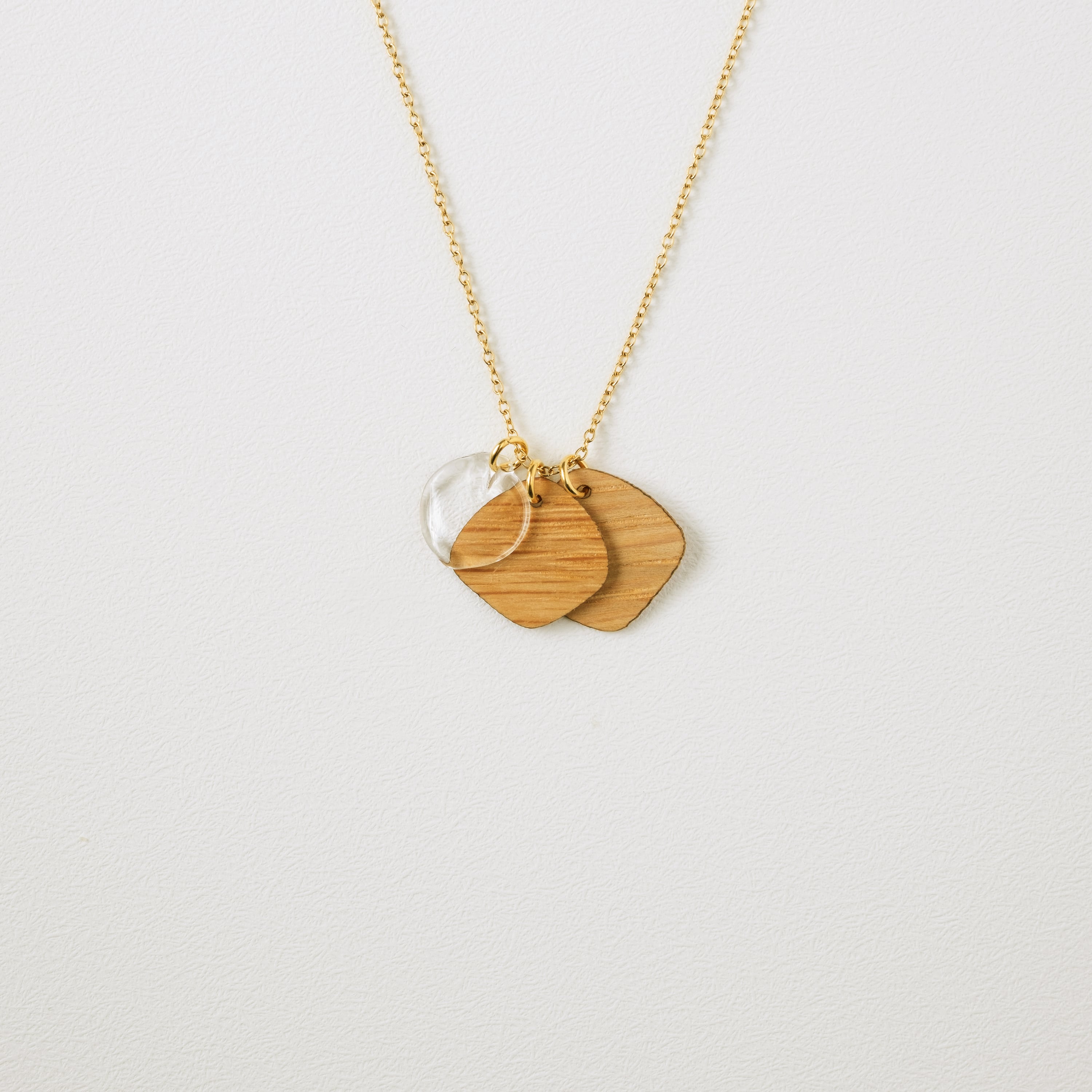 繊細な作りになるようパーツ一つ一つを吟味し、着けているのを忘れるほどの軽さに仕上げています。天然の素材を使用しているので一つずつ木目の表情が違い、手作りのガラスパーツも大きさや形が異なるのが魅力の一つです。